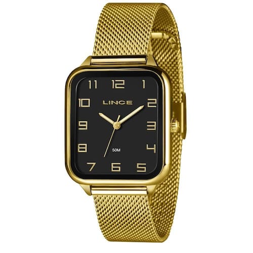 O Relógio Lince Feminino MQGH248L34 P2KX traz um design moderno e sofisticado, com caixa quadrada em metal dourado de 34mm e mostrador preto de fácil leitura. Sua pulseira de aço mesh dourada garante conforto, estilo e ajuste perfeito ao pulso.