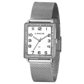 Características - Bateria - Coroa: Simples - Tampa posterior: Pressão - Resistência à água: 50m - Vidro: Cristal Mineral - Mostrador Branco com numeros - Material da caixa: Metal Quadrado com pedras internas cravejadas - Material da pulseira: Aço prata tipo esteira / mash