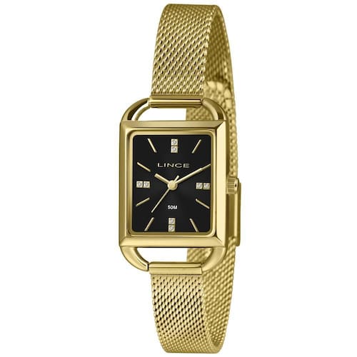 Relógio Lince Feminino Ref: Lqg4790l24 P1kx Retangular Mesh Dourado DESCRIÇÃO DO PRODUTO: Caixa: Metal Pulseira: Malha de Aço Mesh Medida da caixa: 24 mm x 28 mm Vidro: Cristal Mineral Resistência à água: 50m Funções: Analógico Mostrador Preto com pedras Fundo Alimentação do maquinário: Bateria Maquinário Japonês de 1 Ano Marca: Não Informado