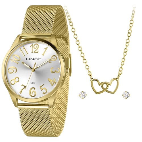 Relógio Lince Feminino Ref: Lrgh222l40 K0das2kx Dourado + Semijoia DESCRIÇÃO DO PRODUTO: Caixa: Metal Pulseira: Malha de Aço Mesh Medida da caixa: 40 mm Vidro: Cristal Mineral Resistência à água: 50m Funções: Analógico Mostrador prateado com todos os números Fundo Alimentação do Maquinário: Bateria Maquinário Japonês + Par de Brincos, Corrente e Pingente Semijoia de 1 Ano Ean: 7891529257524