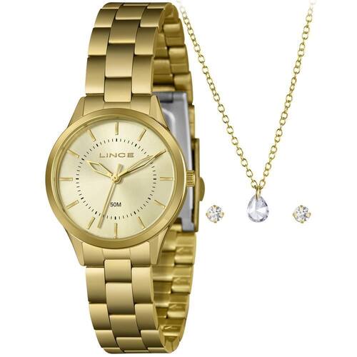 Caixa: Metal Pulseira: Aço Medida da caixa: 30 mm Vidro: Cristal Mineral Resistência à água: 50m Funções: Analógico Mostrador dourado Fundo de Pressão Alimentação do Maquinário: Bateria Maquinário Japonês + Par de Brincos, Corrente e Pingente Semijoia