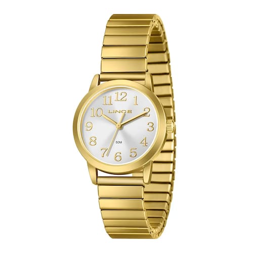 Características: Caixa Dourado e Pulseira em Aço Tipo Mola Dourado