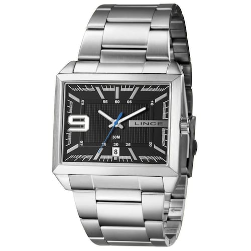 Marca: Lince Gênero: Masculino Vidro: Cristal Mineral Funções: Analógico, Calendário Resistência à Água: 50 m Características: com caixa metal e pulseira de Aço Inoxidável Diâmetro da Caixa: 46 mm x 36 mm Fundo de Pressão Alimentação do Maquinário: Bateria Mostrador preto com número