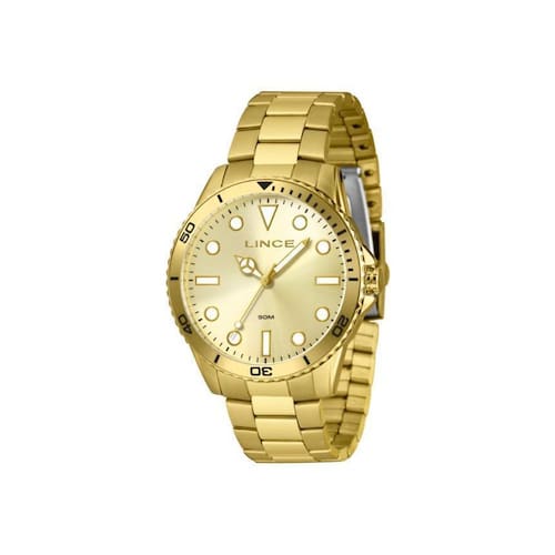 Características - Bateria - Coroa: Simples - Tampa posterior: Pressão - Resistência à água: 50m - Vidro: Cristal Mineral - Mostrador Azul com detalhes dourado - Números e Cifras fluorescentes - Aro Besel externo fixo Azul - Material da caixa: Metal Dourado - Material da pulseira: Aço Dourado