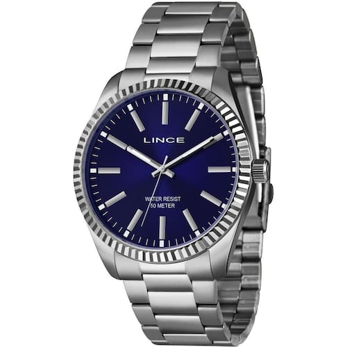 Marca: Lince Gênero: Masculino Vidro: Cristal Mineral Funções: Analógico Resistência à Água: 50 m Características: com caixa metal e pulseira de Aço Inoxidável Diâmetro da Caixa: 46 mm Fundo de Pressão Alimentação do Maquinário: Bateria Mostrador azul
