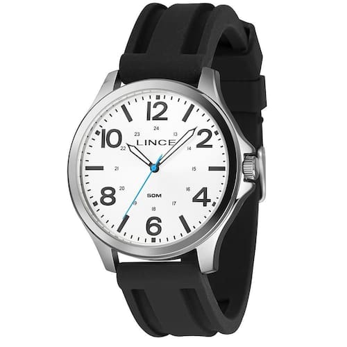 Marca: Lince Gênero: Masculino Vidro: Cristal Mineral Funções: Analógico Resistência à Água: 50 m Características: com caixa metal e pulseira de Silicone Preta Diâmetro da Caixa: 46 mm Fundo de Pressão Alimentação do Maquinário: Bateria Mostrador branco com números