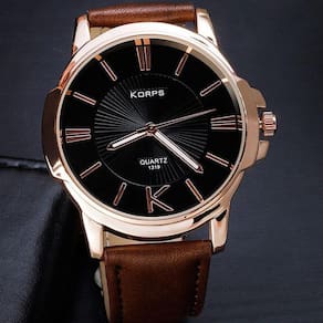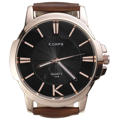 Relógio Luxo Masculino Korps 1319 Bronze Fundo Preto Pulseira Couro Marrom Design premiado e sucesso de vendas no mundo todo, este é o relógio do momento. Excelente relógio design italiano, luxoso e extremamente elegante, perfeito para causar um grande impacto. Relógio Luxo Masculino Korps 1319 Bronze Fundo Preto Pulseira Couro Marrom Marca: Korps Modelo: 1319 Referência do Modelo: 1319BPM Cor de Fundo: PretoCor da Caixa: Bronze Inox Cor da Pulseira: Marrom Couro Estilo: Elegante Luxo Casual Material da Caixa: Aço Inoxidável Tipo Mostrador: Analógico Movimento: Quartzo Bateria Formato da Caixa: Redondo Espessura da Caixa: 8mm Diâmetro da Caixa: 45mm Peso Líq: 46g Fechamento: Fivela Material da Pulseira: Couro Natural Comprimento da Pulseira: 25cm Largura da Pulseira: 22mm Relógio resistente a água: Banho, Respingos e Chuva. Itens: 1 Relógio + 1 Embalagem de Alumínio Escovado