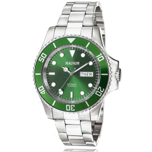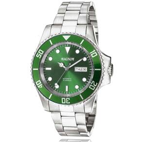 Relógio magnum masculino ref: ma35075g automático prateado Descrição do produto: Caixa de aço inoxidável Pulseira aço inoxidável Fundo rosqueado com detalhe de vidro que permite a visualização do maquinário Vidro: cristal mineral Resistência à água: 5 atm Diâmetro / largura da caixa: 43.00 mm Funções: analógico, calendário duplo Alimentação do maquinário: automático mecânico Mostrador verde Estilo clássico 2 anos de garantia