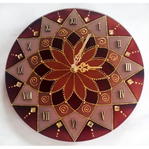 As mandalas são excelentes objetos decorativos, pois além trazer as energias das cores, imprimem uma atmosfera de alegria, beleza e felicidade. Ideal para presentear amigos e pessoas estimadas, oferecendo boas vibrações. Relógio em vidro de 25cm de diâmetro, pintura em vitral, decorado com tinta relevo dourada e pedrinhas acrílicas. Funcionamento: 1 pilha, tamanho AA, de 1.5v. Produto artesanal, feito a mão. Ean: 7899895468599