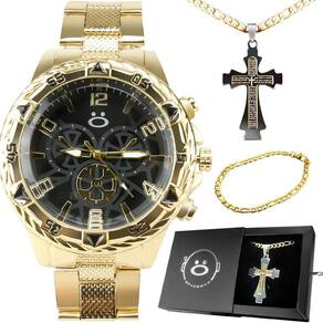 Relógio masculino aço banhado + cordão crucifixo + pulseira presente dourado inoxidável casual preto Kit Elegância Celestial Masculino: Relógio Orizom Spaceman Dourado + Acessórios Banhados em Aço Inoxidável