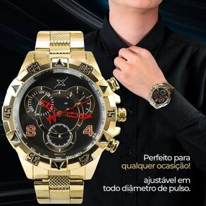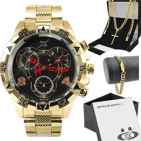 Relogio masculino aço dourado + pulseira + caixa social ponteiro presente pesado analogico grande Kit de Presente Orizom Spaceman X - Relógio Masculino, Corrente, Pingente e Pulseira