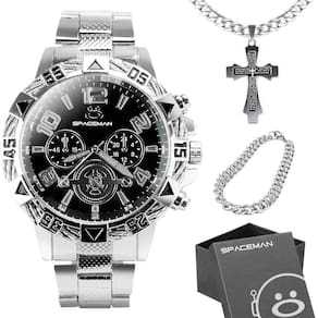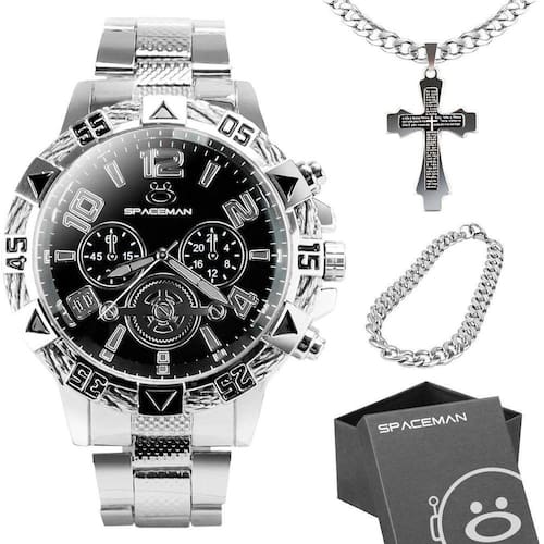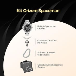 Relogio Masculino Aço Inox + Caixa + Corrente Preto Casual Social Presente Analogico Kit Relógio Orizom Spaceman Aço Inox + Cordão + Pulseira Pai Nosso