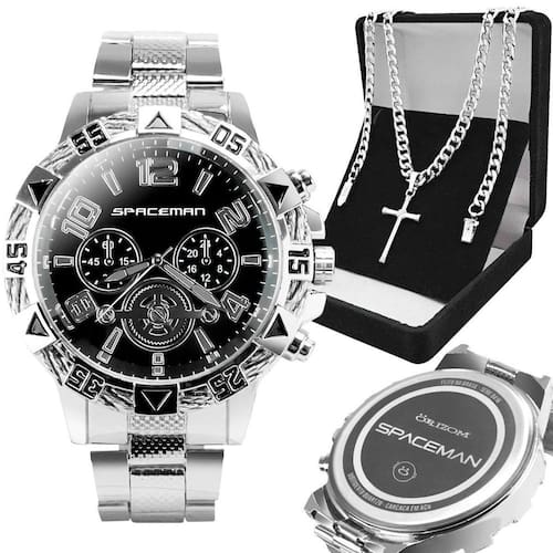 Relogio masculino aço inox + cordão cruz preto social casual Kit Presente Masculino - Relógio Orizom Spaceman + Corrente e Pulseira em Aço Inoxidável