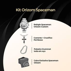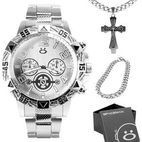 Kit Relógio Orizom Spaceman Aço Inox + Corrente + Pingente Pai Nosso + Pulseira!- Adicione elegância ao seu visual com o Relógio Analógico Masculino todo em prata da Orizom Spaceman, feito em aço inoxidável de alta qualidade.- Complemente o relógio com a Corrente em aço inoxidável de 60cm, adicionando um toque moderno e sofisticado ao seu estilo.- Transmita um significado especial e espiritualidade com o Pingente grande em forma de crucifixo com "Pai Nosso" gravado a laser de 4cm.- Realce o seu visual com a Pulseira em aço inoxidável prata estilo grumet de 21cm, completando o conjunto com um toque de estilo.- Garanta proteção e elegância ao guardar ou presentear este kit exclusivo com a Caixa premium Orizom Spaceman fornecida.Este kit oferece uma combinação perfeita de estilo, qualidade e significado, tornando-se um presente memorável para diversas ocasiões. Adquira já o seu e surpreenda-se!