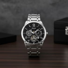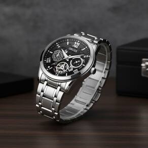 Relógio masculino elegante feito em aço inoxidável prata, com mostrador preto detalhado em estilo esqueleto. Com design sofisticado e marcadores romanos, oferece presença e estilo para uso diário ou ocasiões especiais. Acabamento premium e pulseira robusta garantem durabilidade e conforto.