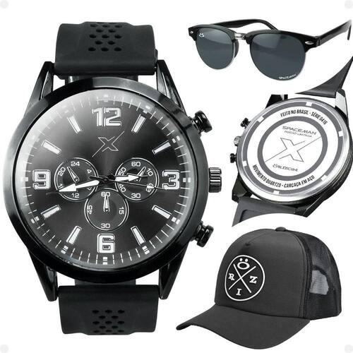 Relógio Masculino Aço Preto + Oculos Proteção Uv + Bone Presente Pulseira Ajustável Preto Social Kit de Presente Orizom Spaceman X - Relógio, Óculos e Boné Prepare-se para arrasar com o Kit de Presente Orizom Spaceman X! Este incrível conjunto inclui um Relógio Masculino Orizom Spaceman X, um par de Óculos Orizom Spaceman X e um Boné Orizom Spaceman.