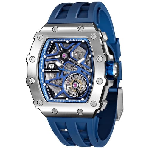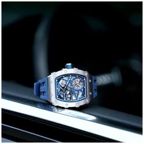 TSAR BOMBA 8209 STAR Guardian Existe um design de rede de estrelas ocas dentro, que simboliza a esperança dos guerreiros. Eles são guerreiros que sofreram centenas de batalhas. Série T 8209, nascida no Laboratório de Força Sino Alemão. É uma cristalização sutil do artesanato relojoeiro e materiais de alta tecnologia. Prêmio internacional de design em forma de barril, ajuste ergonômico. Com design oco de alta transparência e dupla face, permitindo que você tenha um senso de visão mecânico transparente e de alta definição.
