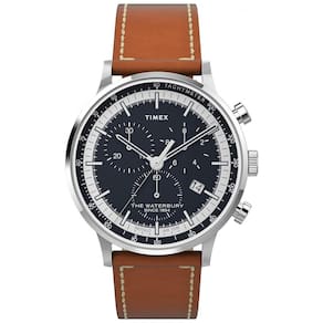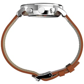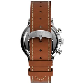A pulseira de couro marrom ajustável de se encaixa na circunferência do pulso de até 8 polegadas barras de mola de liberação rápida Marinho e mostrador branco com janela de data às 4 horas marcadores completos O cronógrafo de 30 minutos mede até 1, 20 de segundo Caixa de aço inoxidável de em tom de prata com cristal de vidro mineral Indiglo light up watch dial mãos luminosas Resistente à água até 30m 100ft em geral, resiste a respingos ou breve imersão na água, mas não é adequado para nadar ou tomar banho