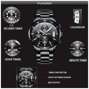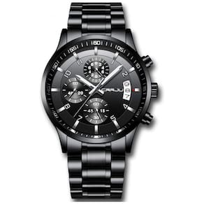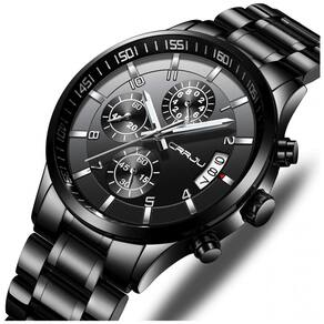 DESIGN ELEGANTE ÚNICO Ponteiro de prata cronógrafos de segundos, minutos e horas calendário clássico DURÁVEL CONFORTÁVEL O movimento do Japão fornece tempo preciso Faixa de aço inoxidável 316L sólida preta espessa, caixa do relógio de chapeamento fosco IP, nunca desbota Hardlex Peso adequado do relógio, superfície lisa do relógio. CAIXA DE PRESENTES PERFEITA com uma luxuosa caixa de relógio CRRJU, uma ferramenta de relógio, cartão de garantia e manual. Este relógio de pulso é um presente íntimo para você ou para aquela pessoa especial IMPERMEÁVEL 3ATM, LAVAR À MÃO, Uso diário, SEM PROBLEMAS NOTA NÃO pressione nenhum botão na água nem use este relógio para atividades subaquáticas de longa duração como mergulho, etc