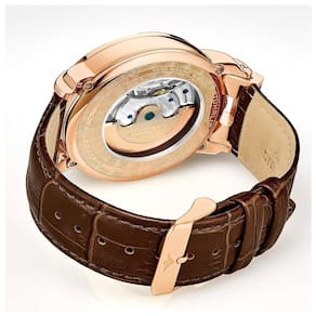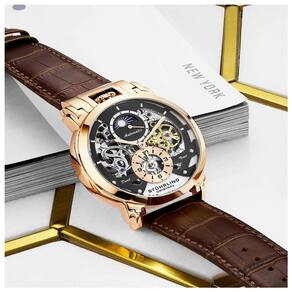 MOVIMENTO DE MESMERIZAÇÃO Mostrador esqueletizado gravado e transparente e fundo de exibição com o Menai 906 permitem que você observe em seu pulso enquanto o mecanismo interno marca a passagem do tempo NENHUMA BATERIA NECESSÁRIA O movimento mecânico automático de corda automática 22 utiliza seus movimentos naturais para manter o relógio funcionando enquanto você o usar DUAL TIME , AM PM Mantenha o controle de 2 fusos horários separados com subdial GMT funcional, controle também noite e dia com o subdial Sun , Moon FAIXA DE COURO GENUÍNA Terminada com uma luxuosa pulseira de couro de crocodilo em relevo, marrom 22mm premium, o 906 combina estilo nítido com conforto inacreditável