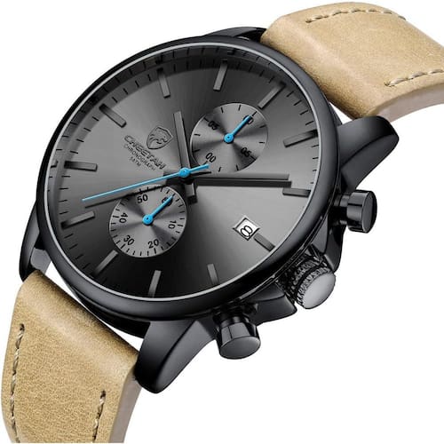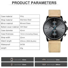 Características: Marca: Cheetah Modelo: 1604 Categoria: Analógico Estilo: Fashion e Casual Movimento: Quartzo Cronógrafo: Ponteiros funcionais Calendário: Sim Diâmetro da caixa visor : 42 mm Espessura da caixa visor : 12 mm Tamanho da pulseira: 255 mm incluindo o fecho Largura da pulseira: 22 mm Tipo de fecho: Fivela Simples Material do Visor: Vidro Mineral Material da caixa: Liga Material da pulseira: Couro Peso liquido: Cerca de 63g Alimentação: Bateria Resistente à Água: 5ATM Garantia: 03 Meses Conteúdo da Embalagem: - Relógio - Manual de instruções em inglês - Certificado internacional de originalidade