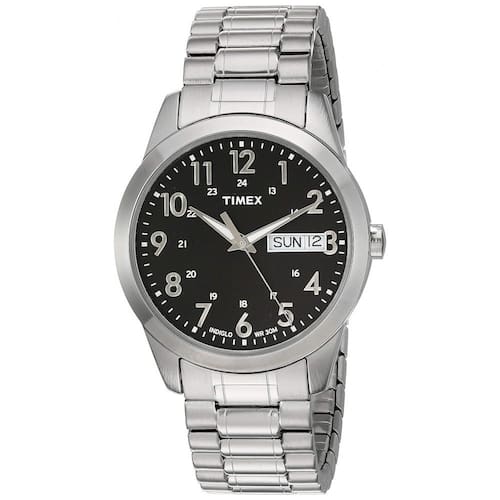 Somos relojoeiros. Desde 1854, acreditamos que como você faz algo é tão importante quanto o que você faz. A banda de expansão de aço inoxidável de em tom prateado se adapta à circunferência do pulso de até 20 centímetros Mostrador preto com janela de dia e data às 3 horas numerais arábicos completos Caixa de latão prateado de com cristal de vidro mineral Indiglo light up mostrador do relógio Resistente à água até 30m 100 pés em geral, resiste a respingos ou breve imersão em água, mas não é adequado para nadar ou tomar banho