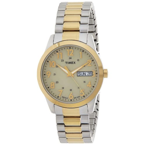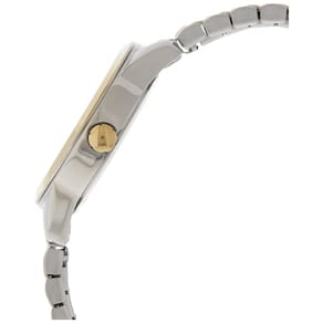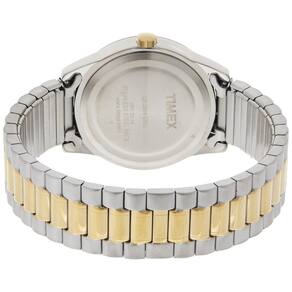 Índices de numeração arábica, movimento de três ponteiros e janela de data às 3 horas Caixa de com janela de mostrador mineral Movimento de quartzo com display analógico Correia intercambiável Slip thru com fecho de fivela Resistente à água até 30m 100 pés em geral, resiste a respingos ou breve imersão em água, mas não é adequado para nadar ou tomar banho