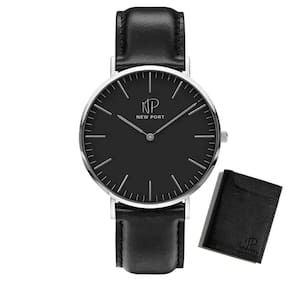 Elegância e praticidade se unem neste exclusivo kit da New Port. O Relógio Masculino Riverside da New Port, com pulseira de Couro Vegano Preta, destaca-se por seu design clássico de 40mm, caixa em metal prateado e mostrador branco protegido por vidro de mineral resistente.