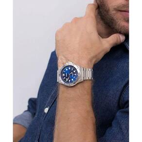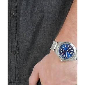 A Caixa (peça onde fica o mostrador) é fabricada em Aço, mede 4,3 cm de diâmetro, sem considerar a coroa, e 1,0 cm de espessura, o que é considerado tamanho Grande para relógios do gênero Masculino. Tem nível de resistência à água especificado em 5 ATM.