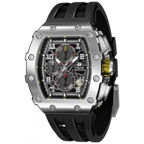 Marca TSAR BOMBA Número do modelo TB 8204SGLZHX Número da peça TB 8204SGLZHX Ano do modelo 2021 Formato do item Tonneau Tipo de material da janela de discagem Cristal de safira Tipo de exibição Analógico Fecho Fivela Material da caixa Aço inoxidável Diâmetro da caixa 5 centímetros Espessura da caixa 16,8 milímetros Material da banda Silicone Tamanho da banda Padrão masculino Largura da banda 22 milímetros Cor da banda Preto Cor do mostrador Prata Material da moldura Aço inoxidável Função do painel Exibição de 12 horas Calendário Data Recursos especiais Cronógrafo, Luminoso, Resistente a choques Movimento Quartzo japonês Profundidade resistente à água 50 metros
