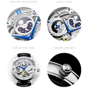 UMA JANELA NO TEMPO O estilo esqueleto permite que você observe visualmente o seu relógio marcar o tempo FAIXA DE COURO GENUÍNA em relevo de jacaré, pulseira de couro real de alta qualidade dos EUA, com de largura ESTILO E CONFORTO IMPRESSIONANTES O design luxuoso é atraente e confortável o suficiente para uso diário. WINDS PRÓPRIO usa tecnologia de mecanismo automático e seus movimentos naturais para dar corda.