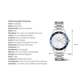 O Relógio Daytona 40mm é um tributo ao universo das corridas clássicas e à engenharia de ponta. Inspirado na lendária atmosfera de Daytona Beach e nas pistas da NASCAR, este modelo da coleção Titanium une performance, sofisticação e minimalismo urbano. Com caixa de 40mm em aço prata cromado, pulseira de elos robusta, e um fundo prata perolado minimalista, o Daytona transmite elegância com espírito competitivo. O decalque lateral azul metálico remete aos detalhes aerodinâmicos dos carros de corrida de elite com muita funcionalidade precisa e sutil. Criado para homens que vivem em movimento, o Daytona representa mais do que estilo — é uma afirmação de ritmo, potência silenciosa e domínio do tempo. Medidas: - Diâmetro 40mm da caixa - Comprimento da Alça 24cm - Espessura da caixa 07mm - Largura da Correia de 20mm ESPECIFICAÇÕES TÉCNICAS - Visor: Analógico - Marca: New Port - Movimento: Quartzo Japonês - Data: Não - Decalque: Sim, Azul Com Detalhes Brancos - Caixa: Aço Inoxidável Prateado - Pulseira: Aço Inoxidável Prateada - Fecho: Fivela Simples - Face: Minimalista Prata Perolado - Mostrador: Mineral Resistente - Ponteiros: 03 - Resistente: A Respingos - Bateria: 377 Com Maior Durabilidade - Design: Minimalista Elegante - Peso: 104g - Categoria: Relógio Masculino - Acompanha: Caixa da marca New Port e Manual - Garantia: 12 meses contra defeito de fabricação Após a confirmação de compra, o código de rastreio será enviado em até um dia útil em seu e-mail. Marca: Não Informado