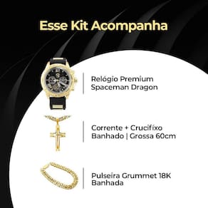 Relogio masculino banhado aço inox + cordão cruz + pulseira Kit Masculino Premium Orizom Spaceman Dragon - Relógio Dourado, Cordão, Pingente e Pulseira - Relógio Dragon Orizom Spaceman: - Design exclusivo com um dragão gravado a laser no fundo preto. - Pulseira ajustável em silicone para qualquer tamanho de pulso. - Tampa blindada para maior durabilidade. - Arte única, feita com precisão a laser. - Ultra premium e personalizado, ideal para presentear. - Cordão Grosso Banhado de 60cm: - Elegante cordão banhado, complementando o estilo do relógio. - Comprimento versátil, adequado para diversas ocasiões. - Pingente Grande de Cruz Banhado 4cm : - Pingente imponente com 4cm de comprimento. - Formato de cruz para um toque espiritual e estiloso. - Banhado a ouro para durabilidade e brilho. - Pulseira Grossa Coordenada: - Pulseira robusta com os mesmos materiais e estilo do cordão. - Combinação perfeita para um visual harmonioso. - Ajustável para se adequar ao pulso. Descrição Geral: O Kit Masculino Orizom Spaceman Dragon é a combinação perfeita de elegância, exclusividade e personalização. O relógio, com seu design único de dragão gravado a laser, é ultra premium e resistente com sua tampa blindada. O cordão, pingente e pulseira coordenados acrescentam um toque de sofisticação, tornando este conjunto ideal para presentear alguém especial. Surpreenda quem você ama com este conjunto exclusivo e cheio de estilo