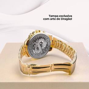 O destaque deste kit é o relógio masculino analógico Orizom Spaceman Dragon, com maquinário e pulseira banhados a ouro, criando um acessório luxuoso e sofisticado. Seu mostrador preto e tampa blindada com desenho exclusivo de dragão acrescentam personalidade e elegância ao visual.