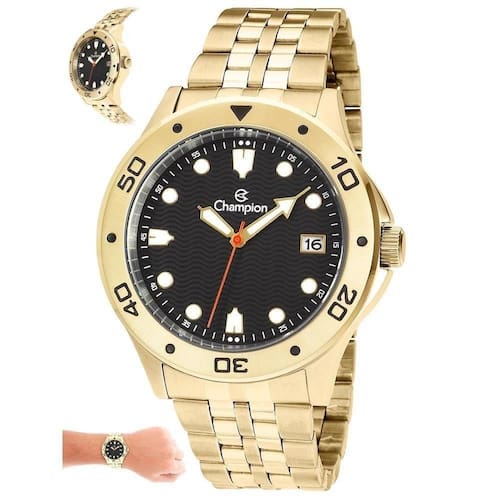 Características: Marca: champion Caixa: formato: redondo material: aço cor: dourado dimensão (lxa): 45mm espessura: (mm): 12mm Fundo tipo: rosca Mostrador cor: preto Vidro material: mineral Pulseira: material: aço cor: dourado fecho tipo: fecho em z pulseira comprimento (mm): 180mm Resistência água: wr (classificação): 50m Peso peso padrão (g): 354g Gênero: masculino Mecanismo: analógico com data alimentação: bateria Garantia fabricante: 12 meses Itens inclusos: 1 estojo relógio modelo ca31453u garantia manual nota fiscal
