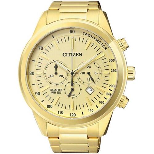 Características: Relógio Citizen, coleção Chronograph, gênero masculino, resistência de 50m, vidro de cristal mineral, movimento Quartzo, com diâmetro de 46mm e aço inoxidável dourado. Ean: 7891511363103