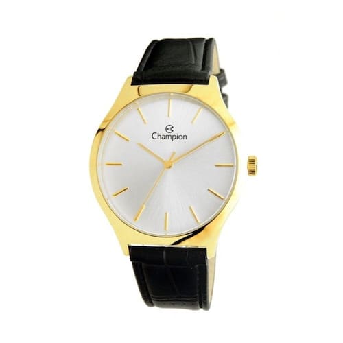 Características Composição do Vidro: Cristal Mineral Material da Caixa: Metal Cor da Caixa: Dourado Material da Pulseira: Couro (Preto) Cor da Pulseira: Preto Mostrador: Fundo Prata com Ponteiros Dourado
