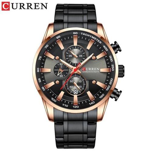 - Tipo De Item: Relógio De Pulso - Marca: Curren - Estilo Do Relógio: Fashion, Moderno, Casual - Gênero: Masculino - Dial Display: Analógico - Movimento: Quartz - Modelo: 8351 e 8363 - Resistência a Água: 3 ATM pelo fabricante não nadar, mergulhar e banho quente . - Característica: Resistente a Água e Choques - Funções: Data e Cronógrafo Funcional - Formato Do Mostrador: Redondo - Diâmetro Do Mostrador: 4,8 cm - Material Do Mostrador: Vidro Hardlex - Espessura Da Caixa: 1,4 cm - Material Da Caixa: Liga Metálica De Alta Qualidade - Cores: Azul/ Rosê, Prata/Azul, Preto/Azul, Branco/Prata, Preto/Rosê. - Tipo De Fecho: Fecho Dobrável Com Trava - Material Da Pulseira: Aço Inoxidável - Cor Da Pulseira: Preto/Dourado - Largura da Pulseira: 2,4 cm - Comprimento Total: 24 cm - Acompanha Caixa Box Ean: 0736568418901