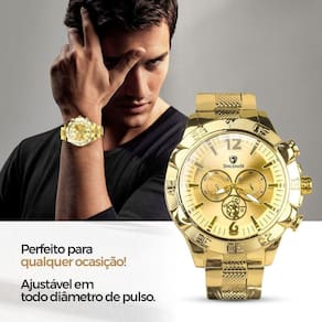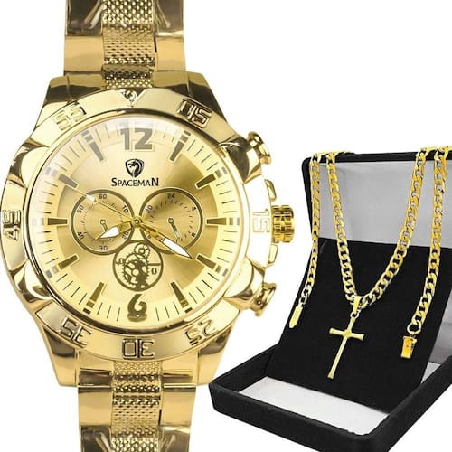 O que acompanha o kit: - Relógio Masculino Analógico Orizom Spaceman Dragon: Fabricado em aço inoxidável com banho dourado de alto padrão, este relógio possui um design sofisticado e robusto, perfeito para uso em diversas ocasiões. Com mostrador dourado elegante e tampa traseira blindada com arte exclusiva de dragão, este relógio é à prova dágua, proporcionando segurança e durabilidade no uso diário. - Corrente Masculina Grumet: Esta corrente em aço inoxidável banhado dourado possui aproximadamente 60 cm de comprimento e um estilo robusto e elegante, que complementa o visual com requinte. - Pingente Crucifixo: Pequeno e confeccionado em aço inoxidável banhado dourado, este pingente em formato de cruz é uma peça de significado e expressão, ideal para compor um visual sofisticado e discreto.