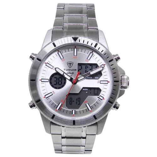 Marca: Tuguir Categoria: AnaDigi Analógico: Sim (1 Horário) Ponteiros Fluorescentes: Não Digital: Sim (1 Horário) Calendário: Sim Despertador: Sim Mostra o Dia da Semana: Sim Mostra o Dia do Mês: Sim Cronômetro: Sim Luz: Sim Cor da Iluminação: Verde Resistente à Água: 5 ATM - Respingos: Sim - Chuva: Sim - Lavar Carro: Sim - Lavar Louça: Sim - Natação: Sim - Mergulho: Não Característica do Vidro: Cristal Mineral Tipo de Fecho: Dobrável com Botão Cor da Caixa: Prata Material da Caixa: Aço Formato da Caixa: Redondo Diâmetro da Caixa: 43,00 (mm) Espessura da Caixa: 14,00 (mm) Cor da Pulseira: Prata Material da Pulseira: Aço Largura da Pulseira: 19,50 (mm) Comprimento Máximo da Pulseira: 270,00 (mm) Alimentação: Bateria Interna Peso Líquido: 0,130 Kg Modelo: GCS-1269 Cor Predominante: Prata Garantia: 12 Meses