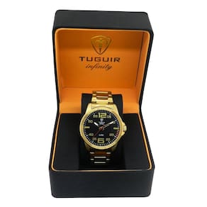 Marca: Tuguir Categoria: Analógico Analógico: Sim (1 Horário) Ponteiros Fluorescentes: Não Digital: Não Luz: Não Resistente à Água: 5 ATM - Respingos: Sim - Chuva: Sim - Lavar Carro: Sim - Lavar Louça: Sim - Natação: Sim - Mergulho: Não Característica do Vidro: Cristal Mineral Tipo de Fecho: Dobrável com Botão Cor da Caixa: Dourado Material da Caixa: Aço Formato da Caixa: Redondo Diâmetro da Caixa: 43,00 (mm) Espessura da Caixa: 9,00 (mm) Cor da Pulseira: Dourado Material da Pulseira: Aço Largura da Pulseira: 20,00 (mm) Comprimento Máximo da Pulseira: 280,00 (mm) Alimentação: Bateria Interna Peso Líquido: 0,110 Kg Modelo: Infinity 9169A Cor Predominante: Dourado Cor Diferencial: Preto Garantia: 12 Meses