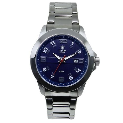 Marca: Tuguir Categoria: Analógico Analógico: Sim (1 Horário) Ponteiros Fluorescentes: Não Digital: Não Luz: Não Resistente à Água: 5 ATM - Respingos: Sim - Chuva: Sim - Lavar Carro: Sim - Lavar Louça: Sim - Natação: Sim - Mergulho: Não Característica do Vidro: Cristal Mineral Tipo de Fecho: Dobrável com Botão Cor da Caixa: Prata Material da Caixa: Aço Formato da Caixa: Redondo Diâmetro da Caixa: 43,00 (mm) Espessura da Caixa: 10,00 (mm) Cor da Pulseira: Prata Material da Pulseira: Aço Largura da Pulseira: 20,00 (mm) Comprimento Máximo da Pulseira: 270,00 (mm) Alimentação: Bateria Interna Peso Líquido: 0,115 Kg Modelo: Infinity 9169D Cor Predominante: Prata Cor Diferencial: Azul Garantia: 12 Meses
