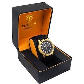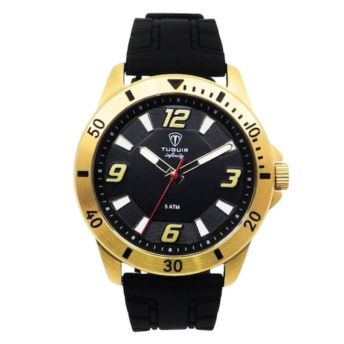 Relógio Masculino de Aço Tuguir Analógico Infinity 9169K Dourado e PretoMarca: Tuguir Categoria: Analógico Analógico: Sim (1 Horário) Ponteiros Fluorescentes: Não Digital: Não Luz: NãoResistente à Água: 5 ATM (Pode ser utilizado para nadar no raso, por pouco tempo submerso) - Respingos: Sim - Chuva: Sim - Lavar Carro: Sim - Lavar Louça: Sim - Natação: Sim - Mergulho: Não Característica do Vidro: Cristal Mineral Tipo de Fecho: Fivela Cor da Caixa: Dourado Material da Caixa: Aço Formato da Caixa: Redondo Diâmetro da Caixa: 43,00 (mm) Espessura da Caixa: 10,50 (mm) Cor da Pulseira: Preto Material da Pulseira: Silicone Largura da Pulseira: 20,00 (mm) Comprimento Máximo da Pulseira: 260,00 (mm) Alimentação: Bateria Interna Peso Líquido: 0,080 Kg Modelo: Infinity 9169K Cor Predominante: Dourado Cor Diferencial: Preto Garantia: 12 MesesConteúdo da Embalagem: 01 Relógio 01 Embalagem 01 Termo de Garantia