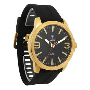 Marca: Tuguir Categoria: Analógico Analógico: Sim (1 Horário) Ponteiros Fluorescentes: Não Digital: Não Luz: Não Resistente à Água: 5 ATM - Respingos: Sim - Chuva: Sim - Lavar Carro: Sim - Lavar Louça: Sim - Natação: Sim - Mergulho: Não Característica do Vidro: Cristal Mineral Tipo de Fecho: Fivela Cor da Caixa: Dourado Material da Caixa: Aço Formato da Caixa: Redondo Diâmetro da Caixa: 43,00 (mm) Espessura da Caixa: 9,00 (mm) Cor da Pulseira: Preto Material da Pulseira: Silicone Largura da Pulseira: 21,00 (mm) Comprimento Máximo da Pulseira: 260,00 (mm) Alimentação: Bateria Interna Peso Líquido: 0,070 Kg Modelo: Infinity 9169L Cor Predominante: Dourado Cor Diferencial: Preto Garantia: 12 Meses