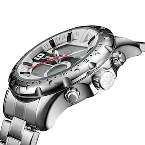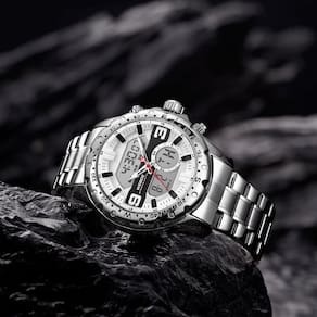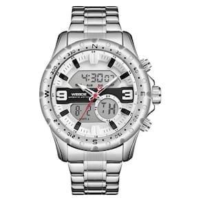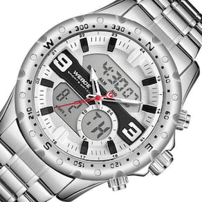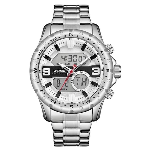 Marca: Weide Categoria: AnaDigi Analógico: Sim 1 Horário Ponteiros Fluorescentes: Sim Digital: Sim 2 Horário Calendário: Sim Despertador: Sim Mostra o Dia da Semana: Sim Mostra o Dia do Mês: Sim Cronômetro: Sim Contador Regressivo: Sim Luz: Sim Cor da Iluminação: Verde Resistente à Água: 3 ATM Resiste a imersões breves - Respingos: Sim - Chuva: Sim - Lavar Carro: Sim - Lavar Louça: Sim - Natação: Não - Mergulho: Não Característica do Vidro: Acrílico Tipo de Fecho: Dobrável com Botão e Trava Cor da Caixa: Preta Material da Caixa: Metal Banho IP Formato da Caixa: Redondo Diâmetro da Caixa: 50,00 mm Espessura da Caixa: 16,10 mm Material da Pulseira: Aço Largura da Pulseira: 22,40 mm Comprimento Máximo da Pulseira: 240,00 mm Alimentação: Bateria Interna Peso Líquido: 0,180 Kg Modelo: WH8502 Garantia: 3 Meses