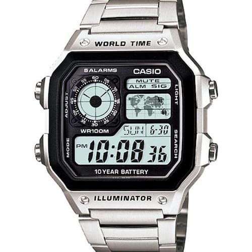Relógio Novo e OriginalVidro com resinaAté 100 Metros à Prova D'águaMaterial do corpo/anel: resinaPulseira de Aço InoxidávelFecho triploLuz LED ÂmbarDuração de luminosidade selecionável, persistência luminosaHoras variadas (4 cidades diferentes)Hora mundial31 fusos horários (48 cidades + coordinated universal time), horário de verão (liga/desliga), troca de cidade de referência/hora mundialCronômetros de 1/100 de segundoCapacidade de medição: 23:59'59.99''Modos de medição: Tempo transcorrido, divisão de tempo, hora no 1º e 2º pontoTemporizadoresUnidade de medição: 1/10 segundoFaixa de entrada: 1 segundo a 24 horas (incrementos de 1 segundo, incrementos de 1 minuto e 1 hora)5 alarmes únicos ou diáriosSinalização a cada horaCalendário totalmente automático (até o ano 2099)Formatos 12/24 horasAtivação e desativação do tom de operação do botãoHorário regular: hora, minuto, segundo, pm (pós-meridiano), mês, data, diaDuração aprox. da bateria: 10 anos com CR2025Medidas: Caixa 4,2 cm Espessura 1,3 cm Peso 91 grs AE-1200WHD-1AVDFGARANTIA DE 12 MESESEmbalagem Manual