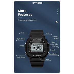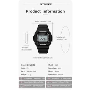 Diâmetro do mostrador: 4,4 cm Material pulseira: pu Largura da pulseira: 2,1cm Comprimento da pulseira: 24, 7cm Fecho: fivela Formato do mostrador: quadrado Peso: 43.8g Não pressionar botões debaixo d'água. 5atm resistente a respingos, chuva, lavar as mãos, banho rápido.