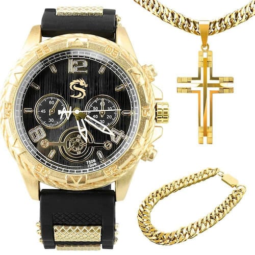 Relogio Masculino Dourado Aço Inox + Cordão Cruz Presente Dourado Analógico Casual Ajustavel Banhado Kit Masculino Premium Orizom Spaceman Dragon - Relógio Dourado, Cordão, Pingente e Pulseira - Relógio Dragon Orizom Spaceman: - Design exclusivo com um dragão gravado a laser no fundo preto. - Pulseira ajustável em silicone para qualquer tamanho de pulso. - Tampa blindada para maior durabilidade. - Arte única, feita com precisão a laser. - Ultra premium e personalizado, ideal para presentear.