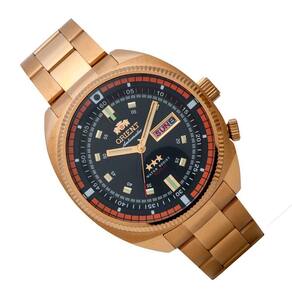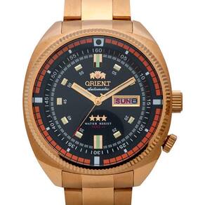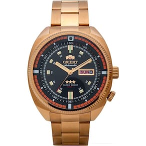 Características Composição do Vidro: Cristal Mineral Material da Caixa: Aço Inox Cor da Caixa: Dourado Material da Pulseira: Aço Inox Cor da Pulseira: Dourado Fundo da maquina: Rosqueado Fechado Mostrador: Fundo Preto, detalhes laranja, com luminosidade Linha: 3 Estrelas Maquinário: Automático com 21 Rubis Funções Calendário Duplo