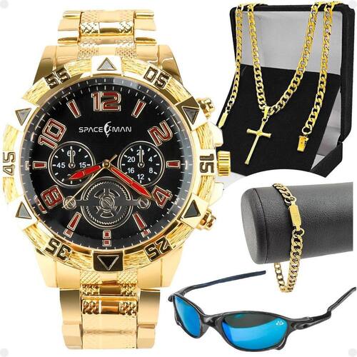 Relogio masculino dourado + cordão + pulseira + oculos sol proteção uv qualidade premium social